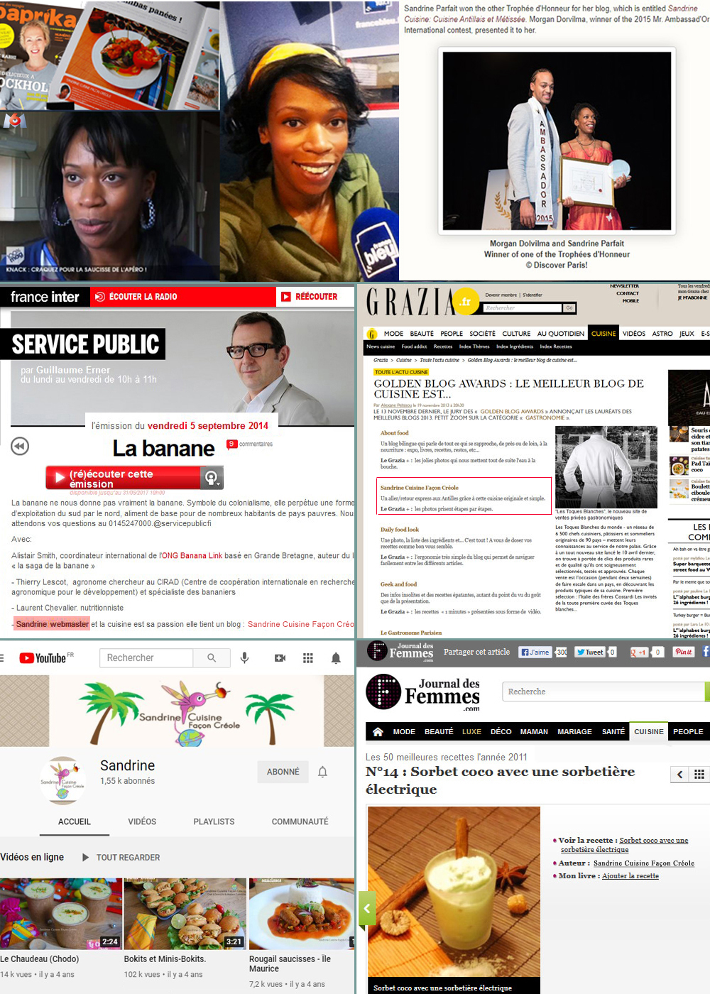- Directrice du blog "Sandrine Cuisine Créole". Blog récompensé en 2015. Mise en place de la charte graphique, création de logos et visuels, photo montage, rédaction de contenus, mise en ligne de vidéo, recherche de sponsors, analyse du trafic, mise en place de jeux concours sur les réseaux, assurer les passages télévisuels radio et presse, Community Managment.